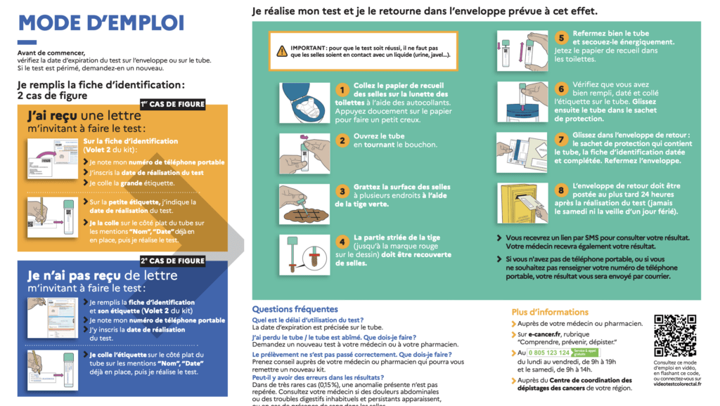 Un mode d’emploi à imprimer est téléchargeable sur ce lien : https://www.ameli.fr/sites/default/files/Documents/meme-kit-depistage-cancer-colorectal-mode-emploi-2023_institut-national-cancer_assurance-maladie.pdf